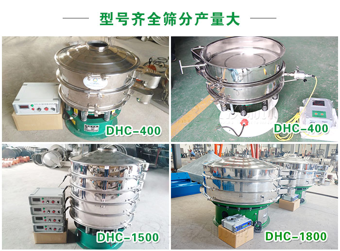 超聲波旋振篩型號齊全產量大,型號有DHC-400、DHC-600、DHC-800、DHC-1000、DHC-1200、DHC-1500、DHC-1800、DHC-2000等,材質可選擇不銹鋼、碳鋼材質。還可根據不同需求特殊定制(加高加緣、安裝進料斗等)。相同型號產量比普通旋振篩產高10-15倍。
